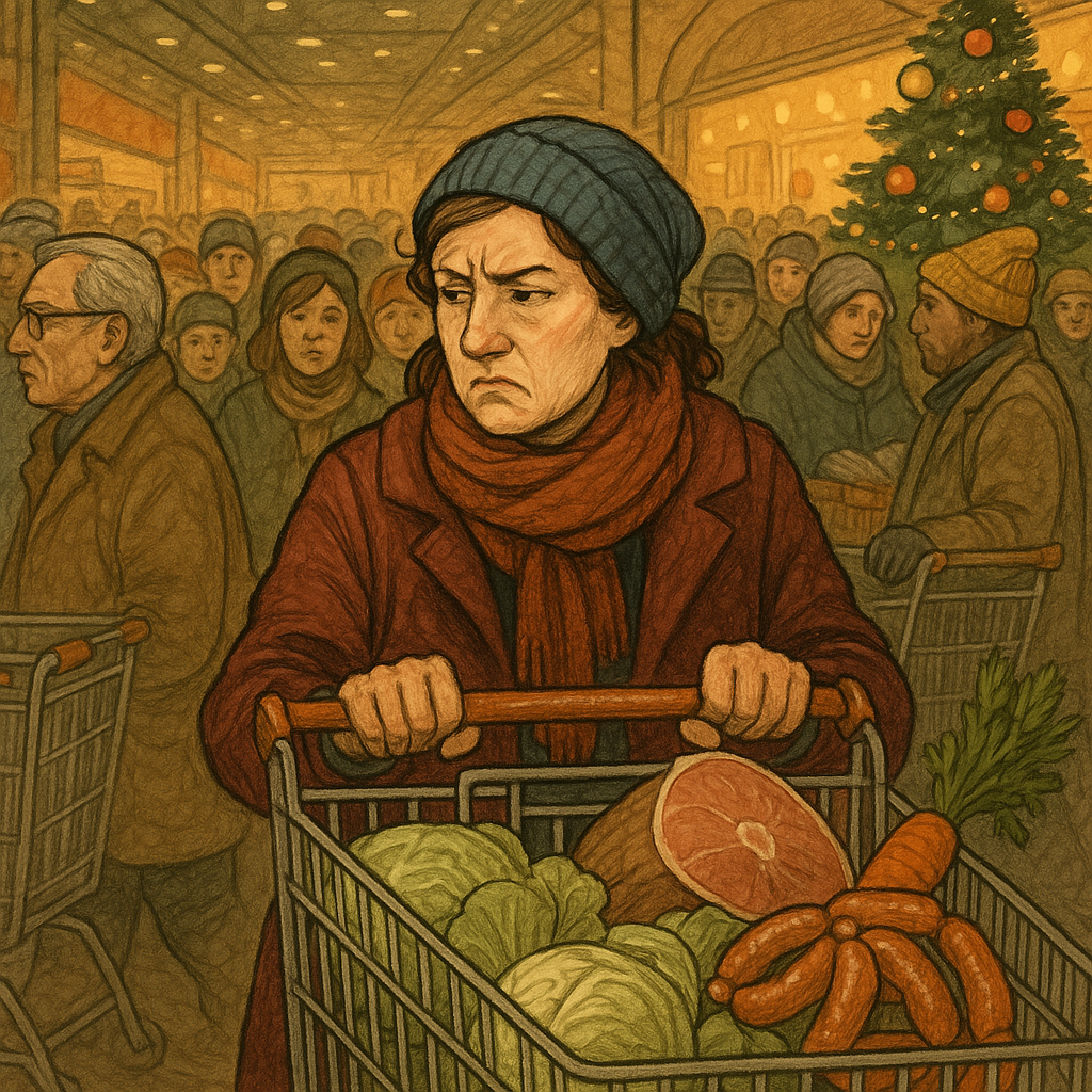 Am renunțat să-mi fac cumpărăturile și am început să caut să ies din mitingul consumatorist. Pe drum spre ieșire mă întâlnesc cu o cunoscută obosită și plină de draci. Vorbim puțin și îmi spune că deja este stoarsă, că trebuie să facă sarmale, cârnați, piftie, salată boef etc. și este disperată că nu știe când apucă și se grăbește cât poate. Mai spunea că s-ar lipsi de toate doar ca să stea liniștită și să citească o carte.