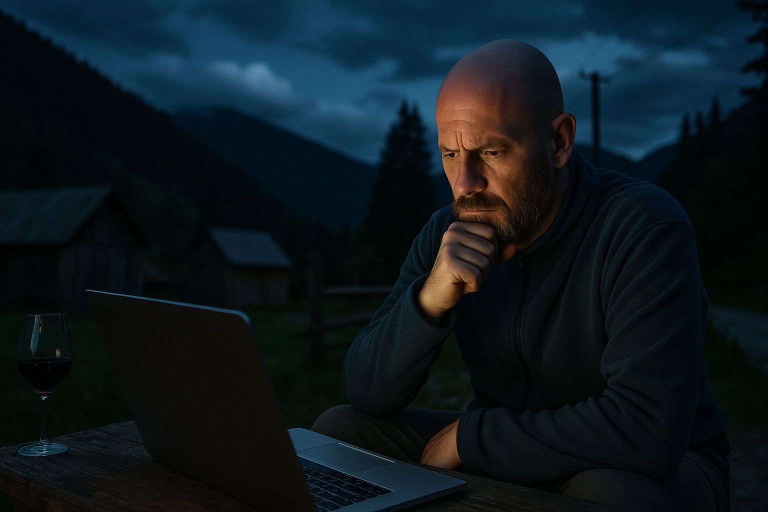 Sunt îngândurat tot drumul. Parcă trăiesc într-un film prost. Ajungem la cabană, tai lemne, fac focul, pornesc apa, ne instalăm, îl culcăm pe Victor și, noaptea, târziu îmi pun un pahar de vin și pornesc o conexiune slabă la internet ca să mai aflu niște știri. Și atunci, privind peste ecranul laptopului la șura vecinului, la uliță, la munții și copacii care se zbat în vânt în lumina lunii, mă lovește: