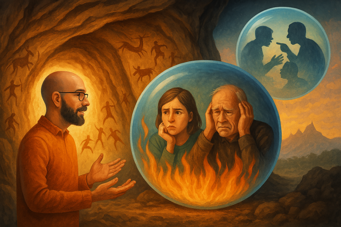Așa că ne-am dezvoltat un mecanism aparte: Atunci când suntem bombardați cu argumente care contestă convingerile grupului din care facem parte, în partea arhaică a creierului nostru, parte responsabilă predominant de emoții, se declanșează o alarmă care indică un mare pericol iminent – acela de a ajunge să fim respinși de colegii noștri de peșteră și a muri singuri, în ploaie, mâncați încet de un urs. Așa că, instinctiv (și uneori inconștient), pornim la luptă ca să apărăm reperele, convingerile și valorile grupului. Neocortexul, responsabil cu logica și cu alte procese cognitive evoluate, s-a dezvoltat mai târziu, este a doua voce pe care o auzim în mintea noastră (după cea a emoțiilor) și folosirea acestei părți a minții noastre necesită mai multă energie și efort.