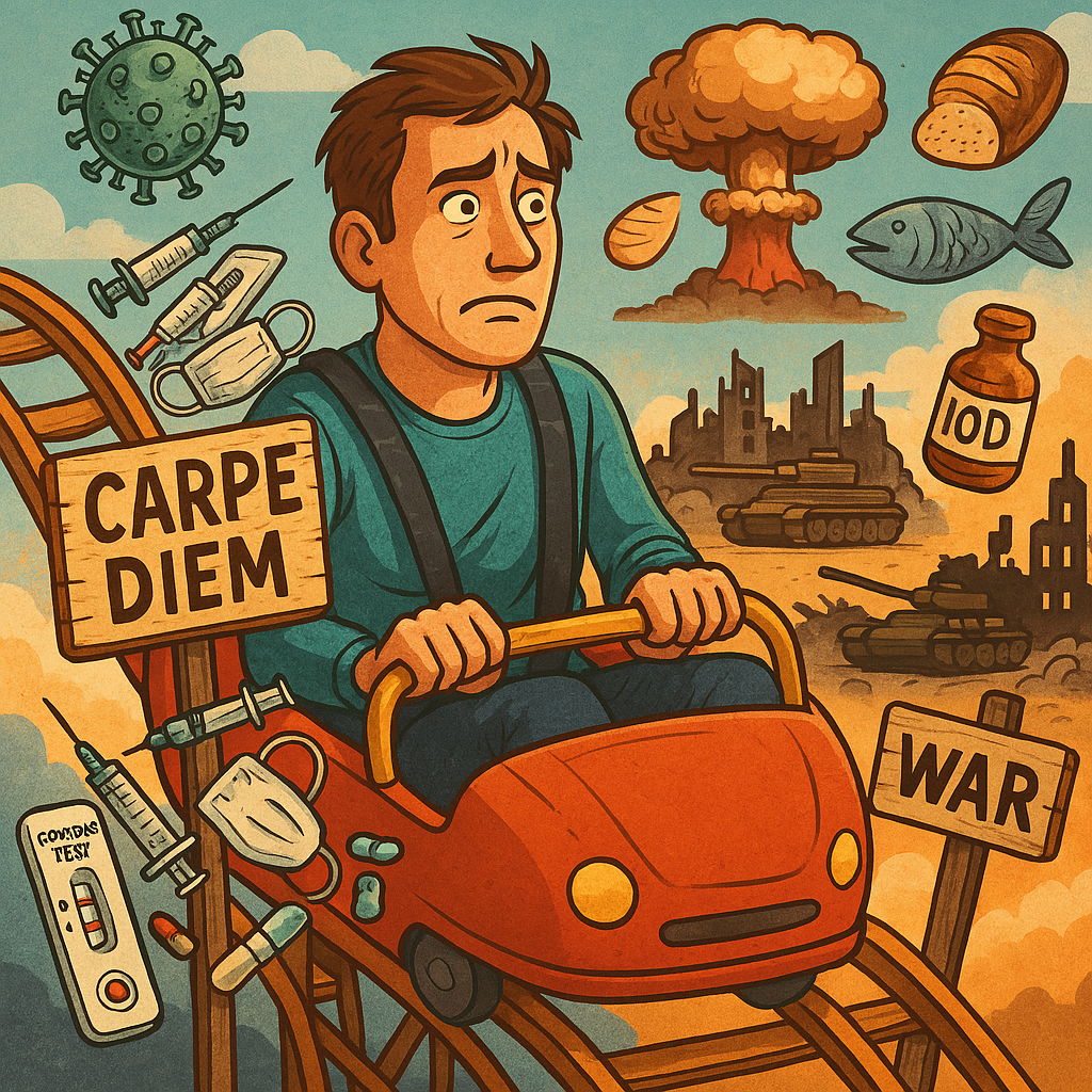 Apoi, încet, au început să se ridice restricțiile. Pare că ne putem relaxa în sfârșit… NOT! A început un război lângă noi! Tancuri distrug orașe, mor oameni, alții fug, alții ajută cu ce pot, este o tragedie generală, prețurile sar în aer și un deștept pendulează rânjind macabru arme atomice. Mama ei de mașinuță! Are cineva iod?…
